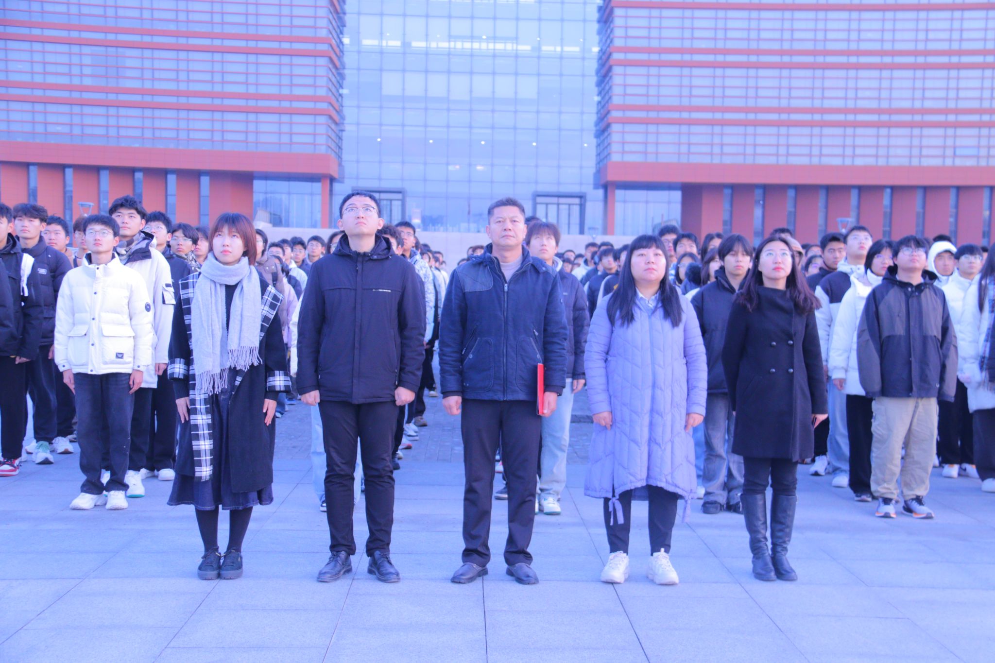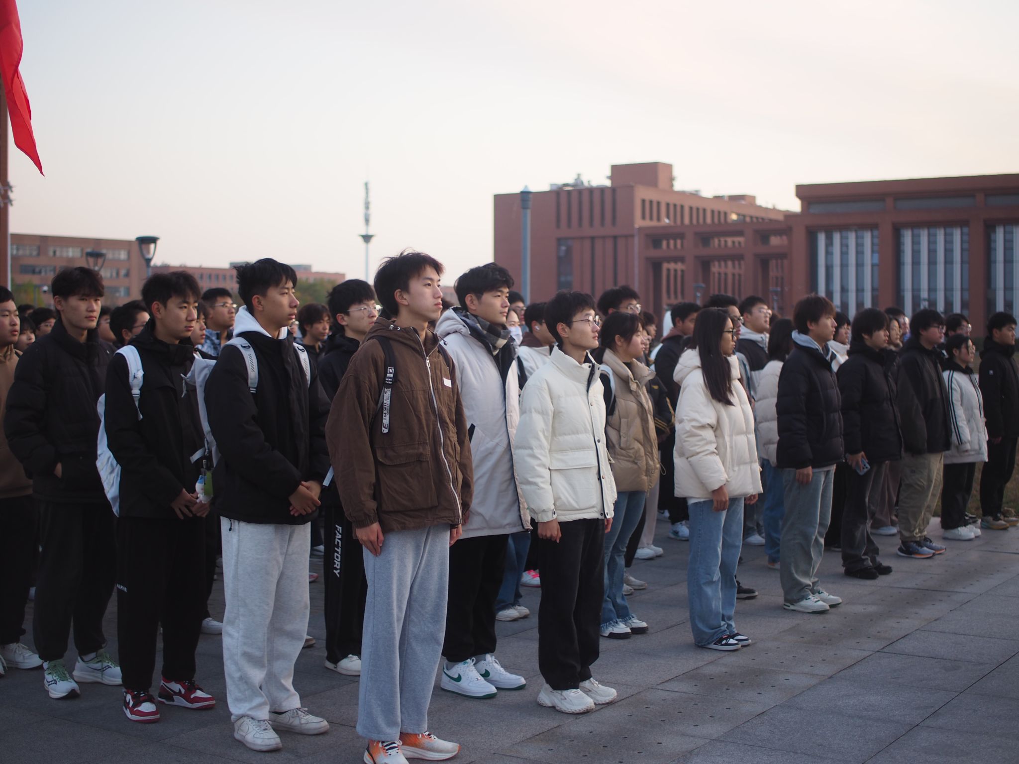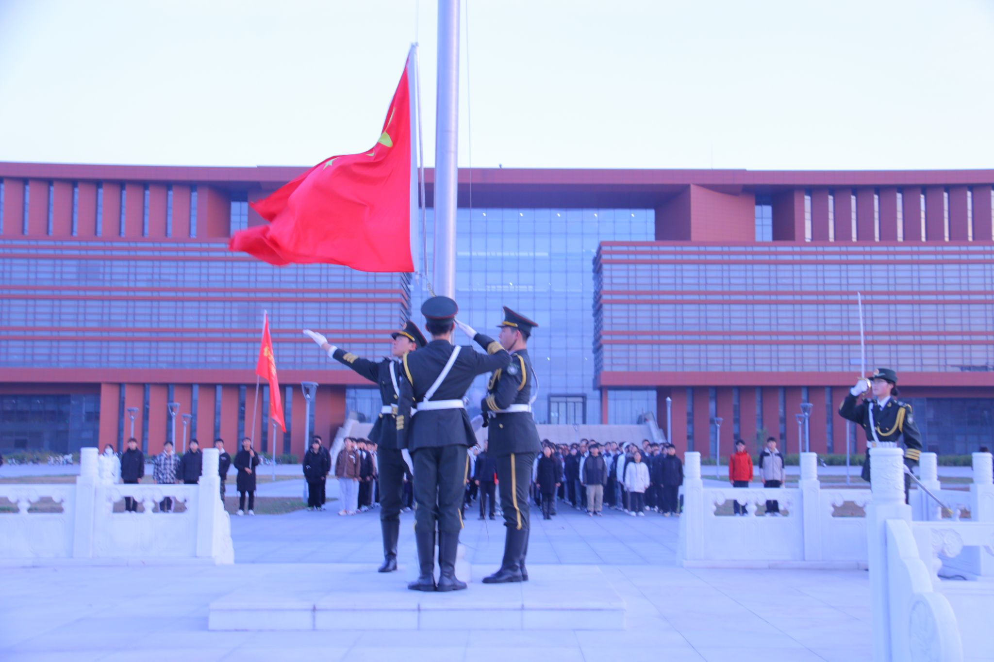 激昂的国歌奏响,鲜艳夺目的五星红旗缓缓地、冉冉地升起。全体师生身姿挺拔、面容庄重肃穆,面向国旗行注目礼。