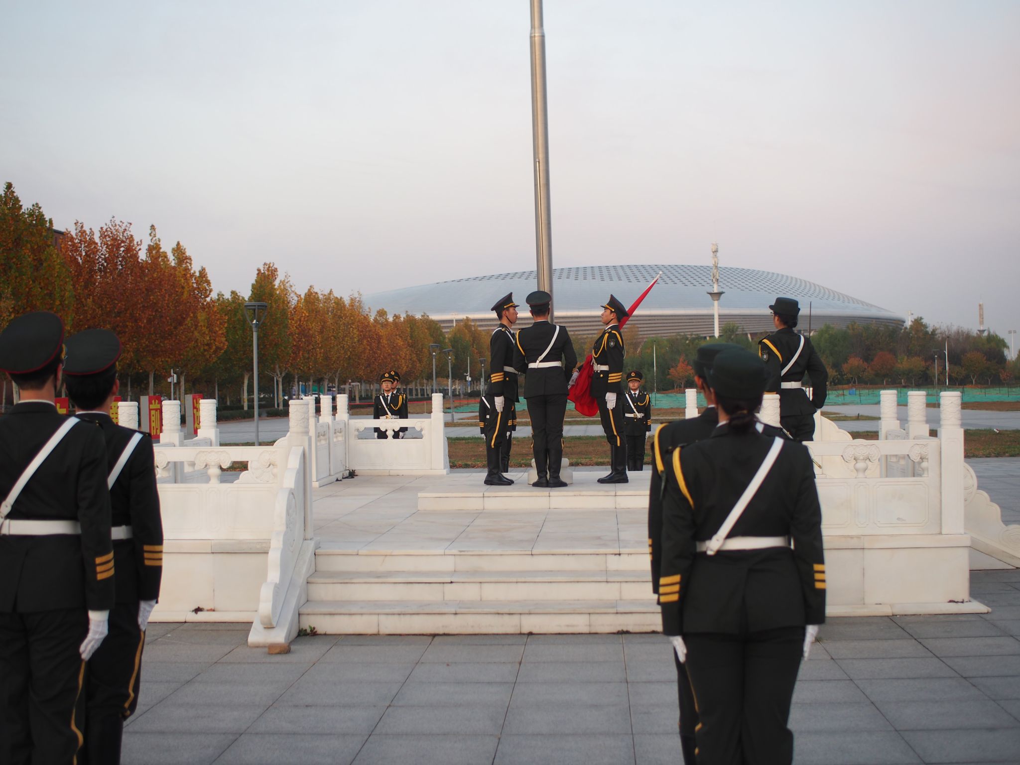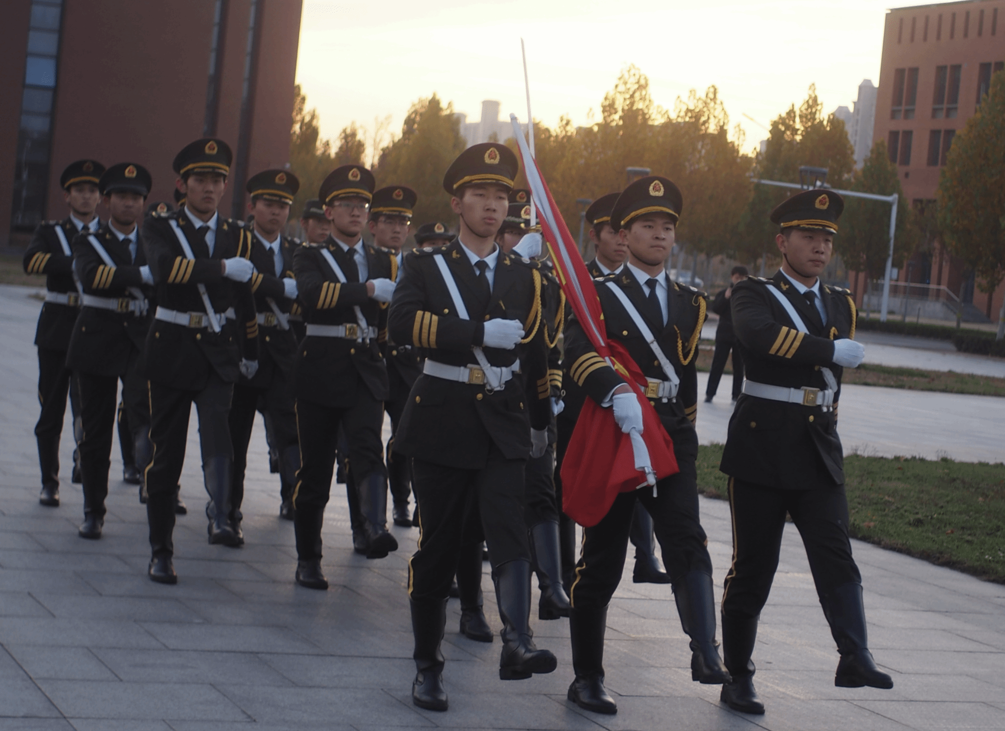 升旗仪式正式开启。在灿烂朝阳的映照下,升旗手、护旗手与国旗护卫队迈着掷地有声、刚劲有力的步伐,向着升旗台行进。