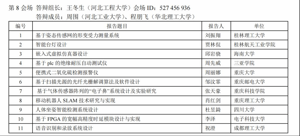 2022 年 5 月 15 日由中国仪器仪表学会教育工作委员会与沈阳市仪器仪表与自动化学会联合主办的首届全国仪器类专业本科生毕业设计交流会以腾讯会议形式召开。本次会议旨在引导仪器类本科专业人才培养观念、模式和方法的变革,使其达到工程教育认证标准,满足企业对仪器专业人才的能力需求。会议征集到来自 26 个省市自治区 125 所高校的 524 篇毕业设计论文,并由来自上述高校的 157 名教师组成了 52 个会场答辩组。我校测控技术与仪器系王冬生、孙芳、郭进喜等老师参加了线上交流会,王冬生担任第8组组长,我校共有5名测控18级本科生参加了论文交流。