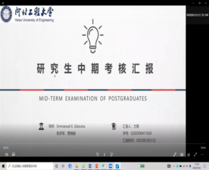 为更加有效落实河北工程大学研究生部对疫情期间研究生学位论文工作的要求,尽量减少疫情对同学们学业的影响,进一步提高研究生培养质量,抓紧抓实研究生培养过程各个环节,5月15日---5月22日,beat365官方网站开展了线上研究生论文中期考核工作。本次工作采用科研团队分方向进行,由beat365官方网站院长张京军教授担任组长,副院长李河宗教授担任副组长,共计39名专家组成考核小组,对73名2020级研究生的研究工作进展情况进行了全面把关和审核。2021级部分研究生进行线上或线下观摩学习。