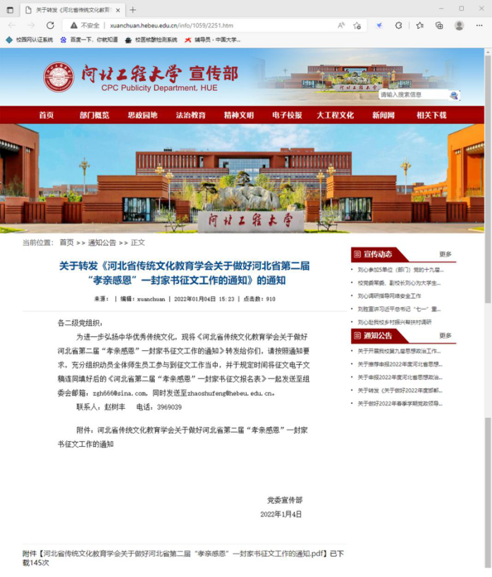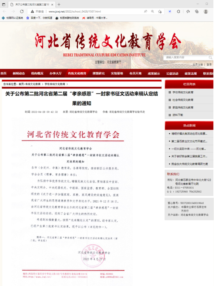 为弘扬中华优秀传统文化、增强民族文化自信、提高广大师生思想道德素质和文字表达水平,河北省传统文化教育学会于2021年12月16日启动了河北省第二届“孝亲感恩”一封家书征文活动。校党委宣传部转发了征文通知并号召我校学生参赛。