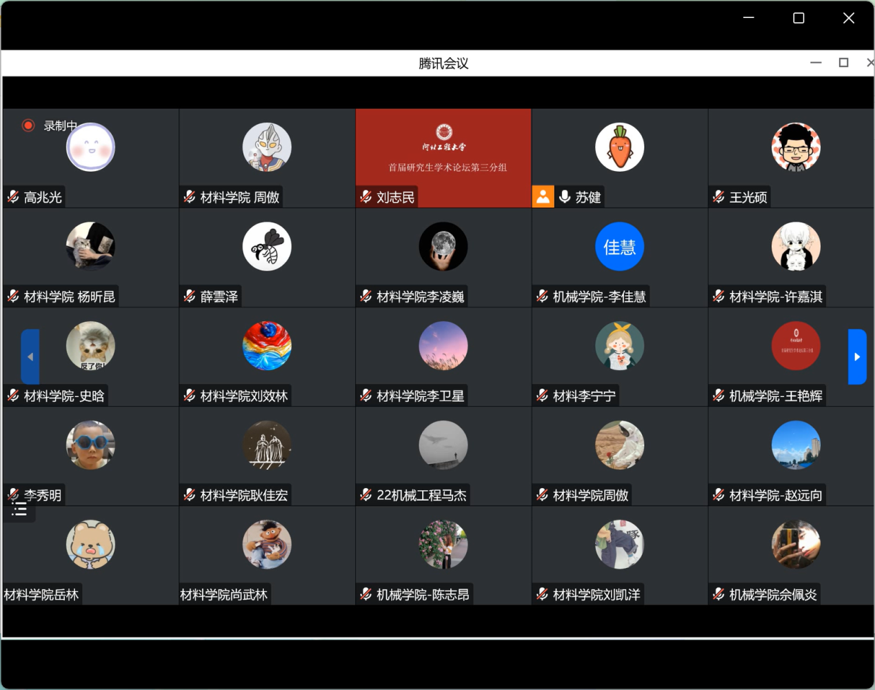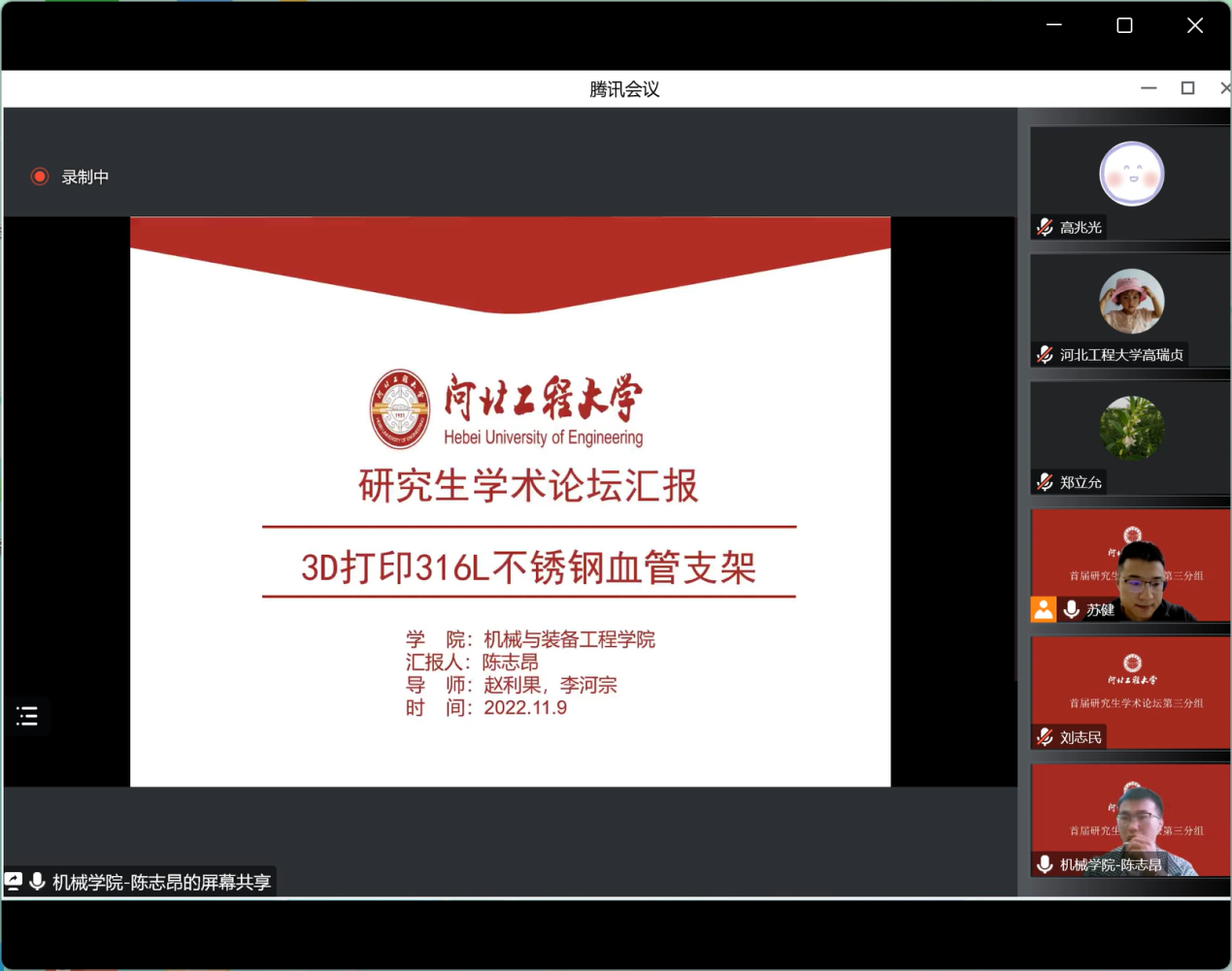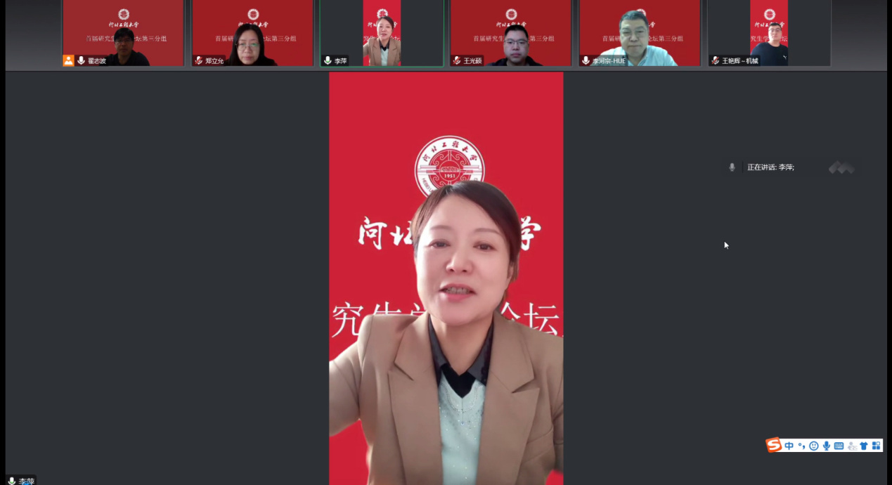 河北工程大学第首届研究生学术论坛“踔厉新时代,创新著华章”第三组分论坛于11月7日、11月9日、11月11日上午九点顺利进行。本次学术论坛会议由研究生部主办,beat365官方网站和材料学院承办第三组分论坛,研究生会协办。beat365官方网站副院长李河宗教授、材料学院副院长李萍教授出席本次论坛学术会议,beat365官方网站翟志波老师、苏健老师主持会议,两个学院共计五位评委老师担任评审工作,本次论坛以腾讯会议的形式线上进行。