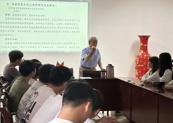 会上王学文老师围绕社会历史文化、自然规律、人生哲理及专业特点与同学们展开讨论,介绍了自然规律、世情、国情、科技对人生的选择影响。